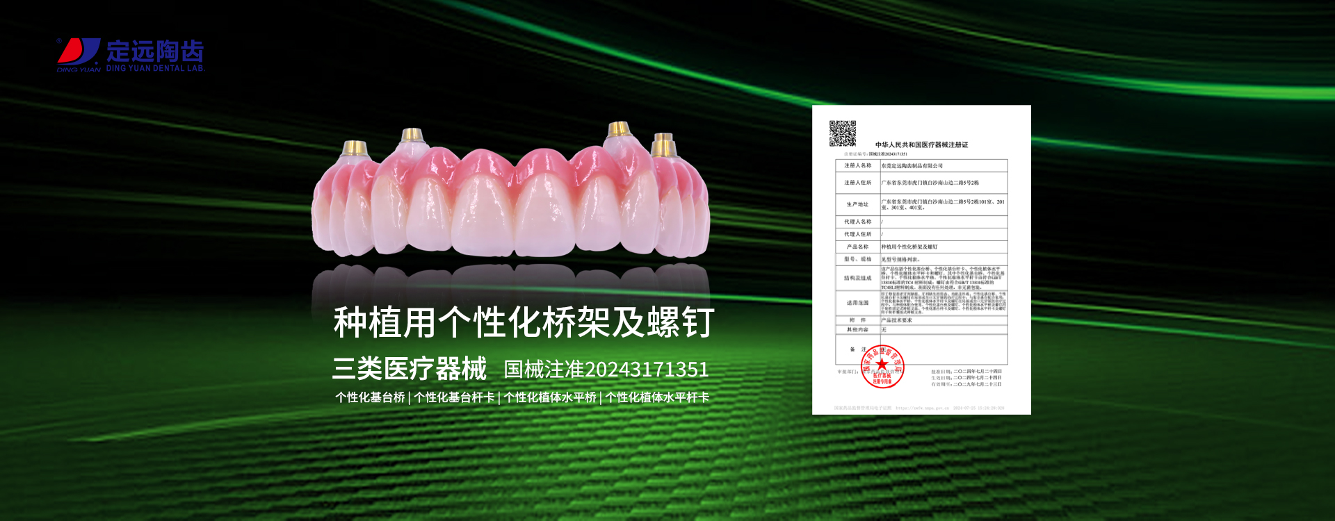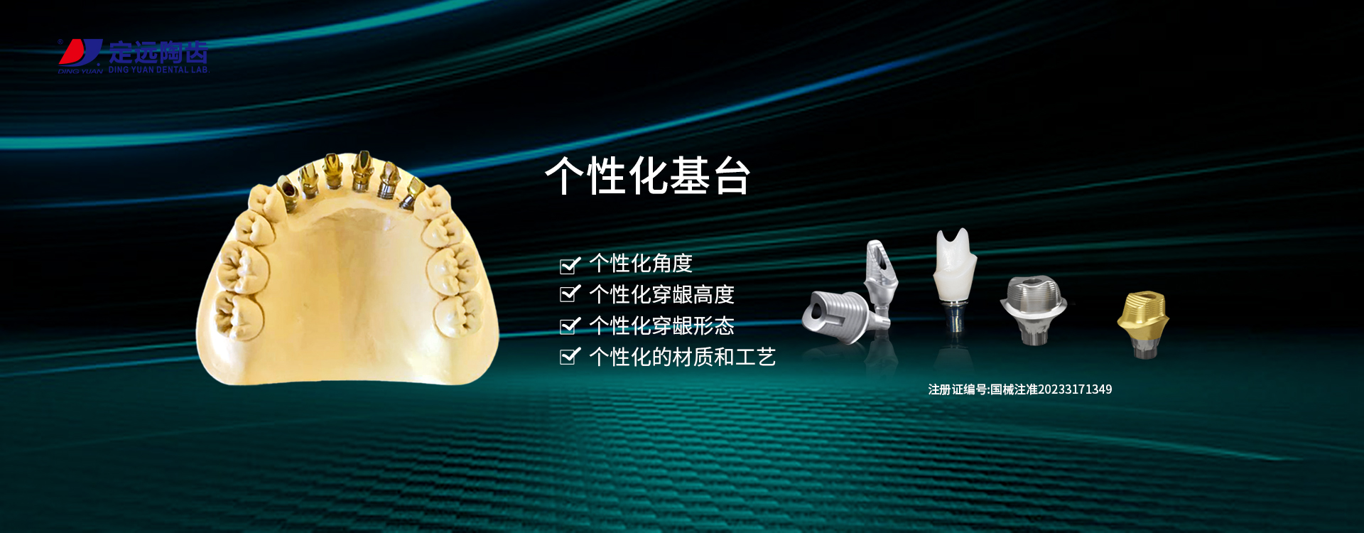 定遠為牙醫提供全面的義齒產品:LAVA、CERCON、微瓷、以及各類品牌氧化鋯全瓷牙,貴金屬瓷牙、SLM激光烤瓷牙、數字化切削純鈦支架、維他靈、BPD支架,以及各種類精密附件、套筒冠、金沉積等,種植上部修復、全口無牙頜種植修復、種植手術導板以及即刻種植修復產品等。